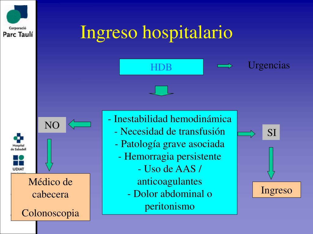 - Inestabilidad hemodinámica - Necesidad de transfusión - Patología grave asociada - Hemorragia persistente - Uso de AAS / anticoagulantes - Dolor abdominal o peritonismo Ingreso hospitalario Urgencias HDB NO SI Médico de cabecera Colonoscopia Ingreso