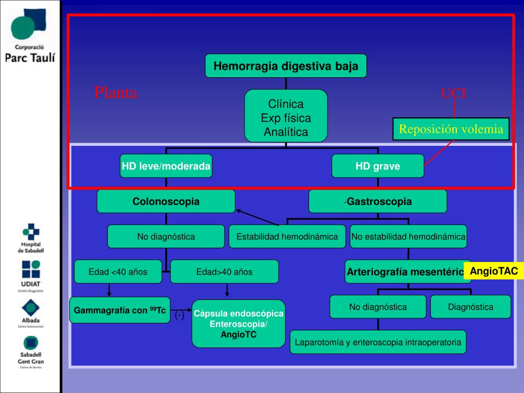Hemorragia digestiva baja Planta UCI Clínica Exp física Analítica Reposición volemia HD leve/moderada HD grave Colonoscopia -Gastroscopia No diagnóstica Estabilidad hemodinámica No estabilidad hemodinámica Edad <40 años Edad>40 años Arteriografía mesentérica AngioTAC No diagnóstica Diagnóstica Gammagrafía con 99Tc Cápsula endoscópica Enteroscopia/ AngioTC (-) Laparotomía y enteroscopia intraoperatoria