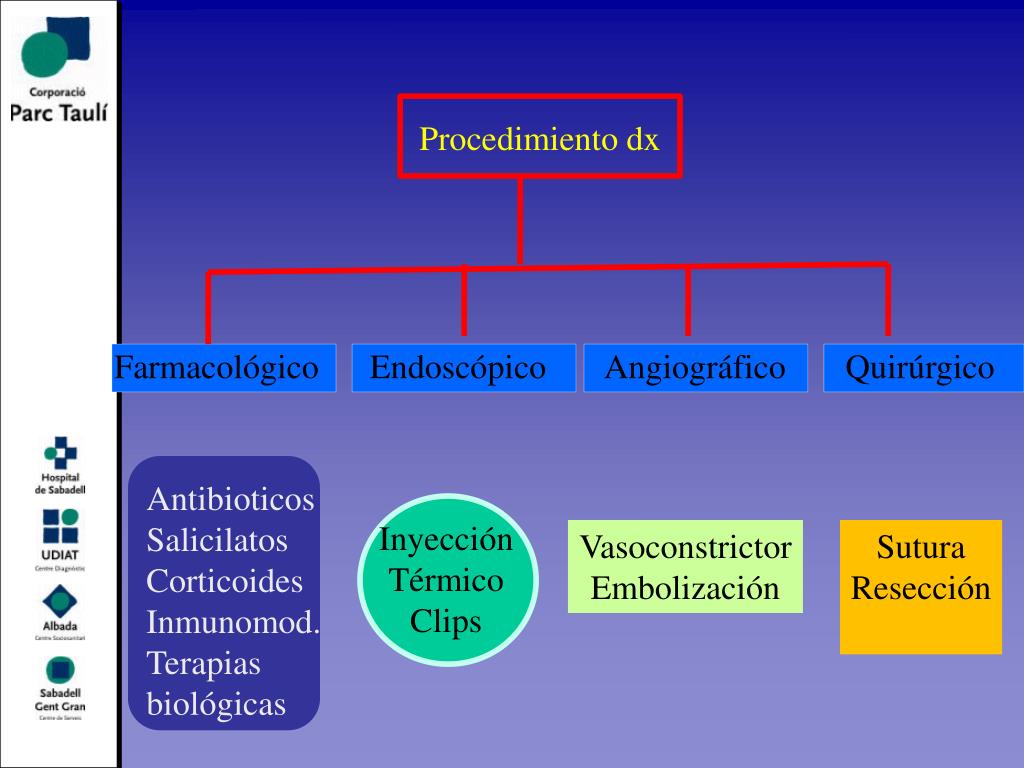 Procedimiento dx Farmacológico Endoscópico Angiográfico Quirúrgico Antibioticos Salicilatos Corticoides Inmunomod. Terapias biológicas Inyección Térmico Clips Vasoconstrictor Embolización Sutura Resección