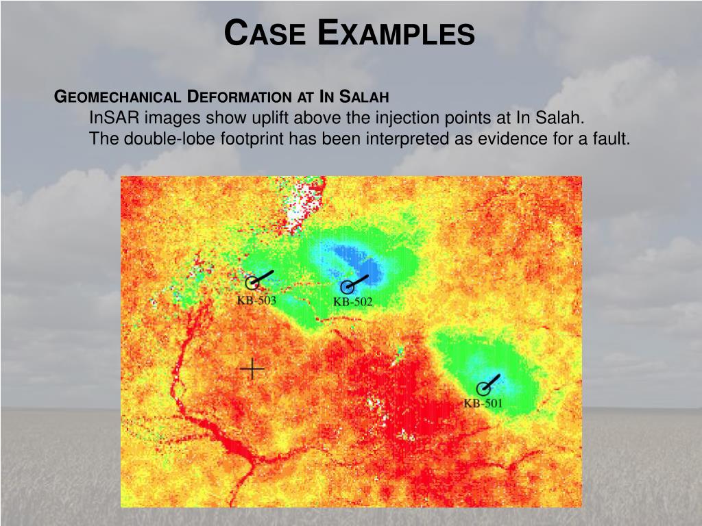 Case Examples • Geomechanical Deformation at In Salah • InSAR images show uplift above the injection points at In Salah. • The double-lobe footprint has been interpreted as evidence for a fault.