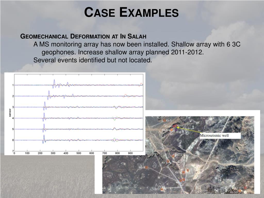 Case Examples • Geomechanical Deformation at In Salah • A MS monitoring array has now been installed. Shallow array with 6 3C geophones. Increase shallow array planned 2011-2012. • Several events identified but not located.