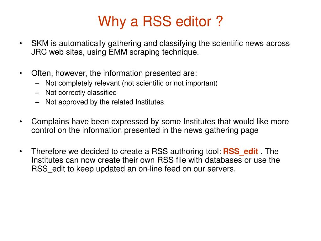 Why a RSS editor ? • SKM is automatically gathering and classifying the scientific news across JRC web sites, using EMM scraping technique. • Often, however, the information presented are: • Not completely relevant (not scientific or not important) • Not correctly classified • Not approved by the related Institutes • Complains have been expressed by some Institutes that would like more control on the information presented in the news gathering page • Therefore we decided to create a RSS authoring tool: RSS_edit . The Institutes can now create their own RSS file with databases or use the RSS_edit to keep updated an on-line feed on our servers.