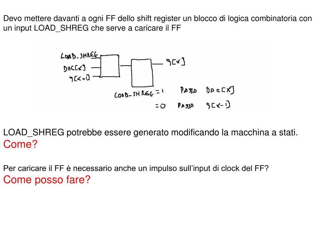 Devo mettere davanti a ogni FF dello shift register un blocco di logica combinatoria con un input LOAD_SHREG che serve a caricare il FF LOAD_SHREG potrebbe essere generato modificando la macchina a stati.Come? Per caricare il FF è necessario anche un impulso sull’input di clock del FF? Come posso fare?