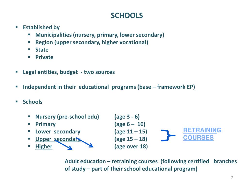 SCHOOLS • Established by • Municipalities (nursery, primary, lower secondary) • Region (upper secondary, higher vocational) • State • Private • Legal entities, budget - twosources • Independent in their educational programs (base – framework EP) • Schools • Nursery (pre-school edu) (age 3 - 6) • Primary (age 6 – 10) • Lower secondary (age 11 – 15) • Upper secondary (age 15 – 18) • Higher (age over 18) • Adult education – retraining courses (following certified branches of study – part of their school educationalprogram) RETRAINING COURSES