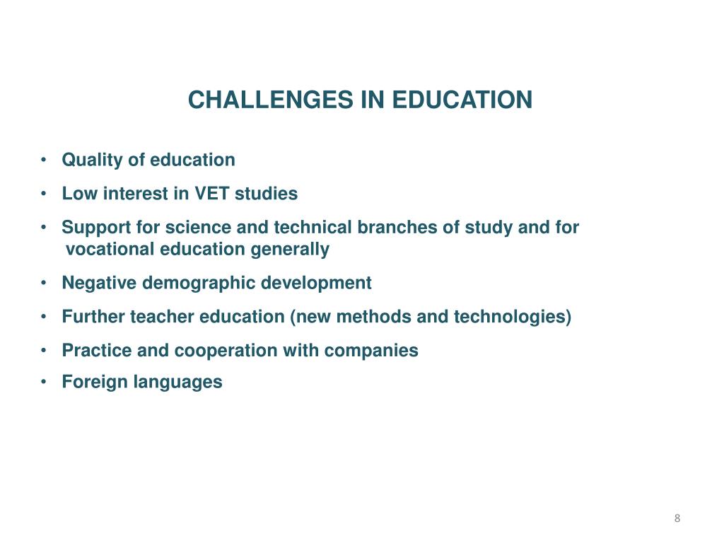 CHALLENGES IN EDUCATION • Quality of education • Low interest in VET studies • Support for science and technical branches of study and for • vocational education generally • Negative demographic development • Further teacher education (new methods and technologies) • Practice and cooperation with companies • Foreign languages