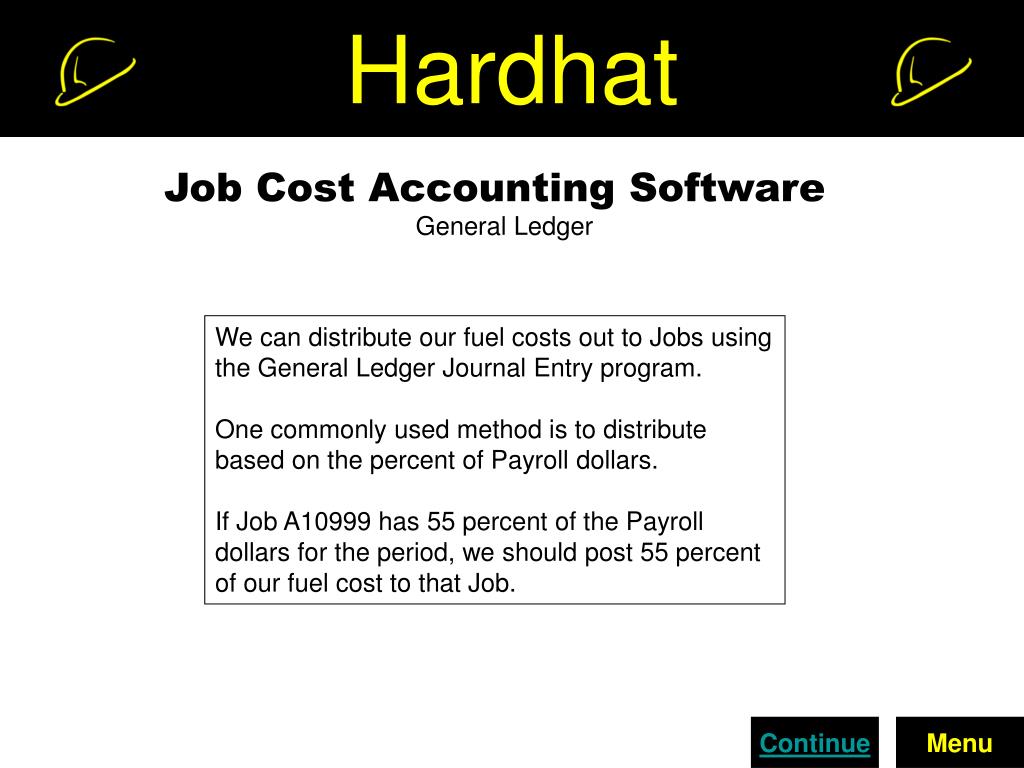Hardhat Job Cost Accounting Software General Ledger We can distribute our fuel costs out to Jobs using the General Ledger Journal Entry program. One commonly used method is to distribute based on the percent of Payroll dollars. If Job A10999 has 55 percent of the Payroll dollars for the period, we should post 55 percent of our fuel cost to that Job. Continue Menu