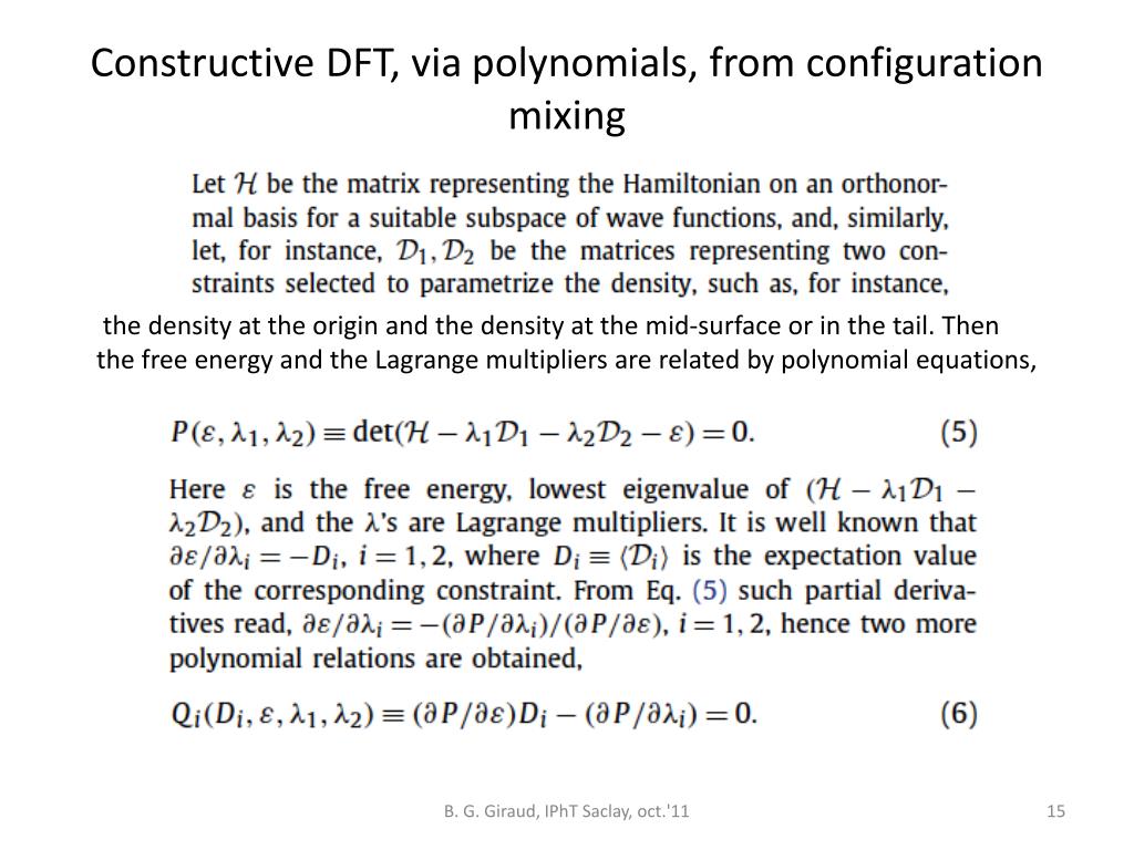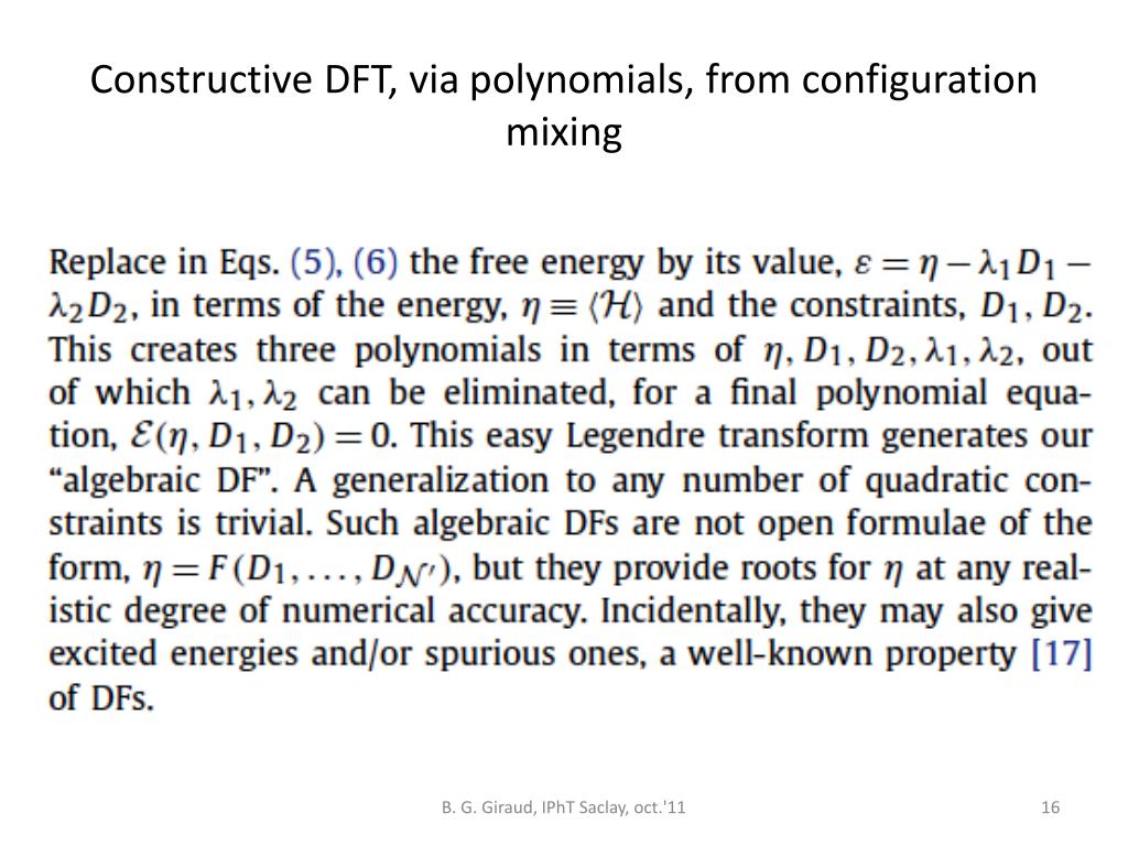 Constructive DFT, via polynomials, from configuration mixing B. G. Giraud, IPhT Saclay, oct.'11