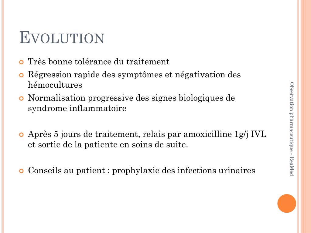 Evolution • Très bonne tolérance du traitement • Régression rapide des symptômes et négativation des hémocultures • Normalisation progressive des signes biologiques de syndrome inflammatoire • Après 5 jours de traitement, relais par amoxicilline 1g/j IVL et sortie de la patiente en soins de suite. • Conseils au patient : prophylaxie des infections urinaires Observation pharmaceutique - ReaMed