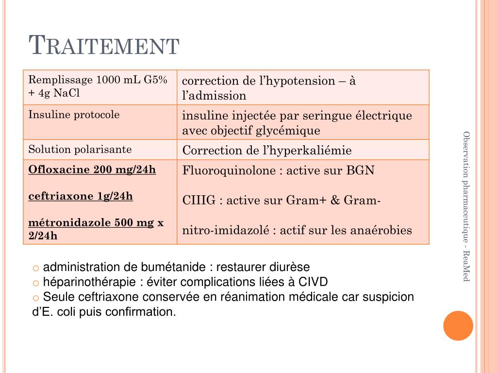 Traitement Observation pharmaceutique - ReaMed • administration de bumétanide : restaurer diurèse • héparinothérapie : éviter complications liées à CIVD • Seule ceftriaxone conservée en réanimation médicale car suspicion d’E. coli puis confirmation.