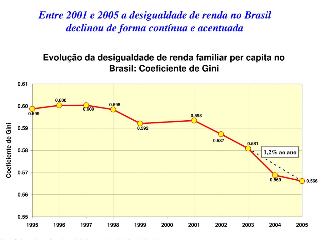 Entre 2001 e 2005 a desigualdade de renda no Brasil declinou de forma contínua e acentuada 1,2% ao ano