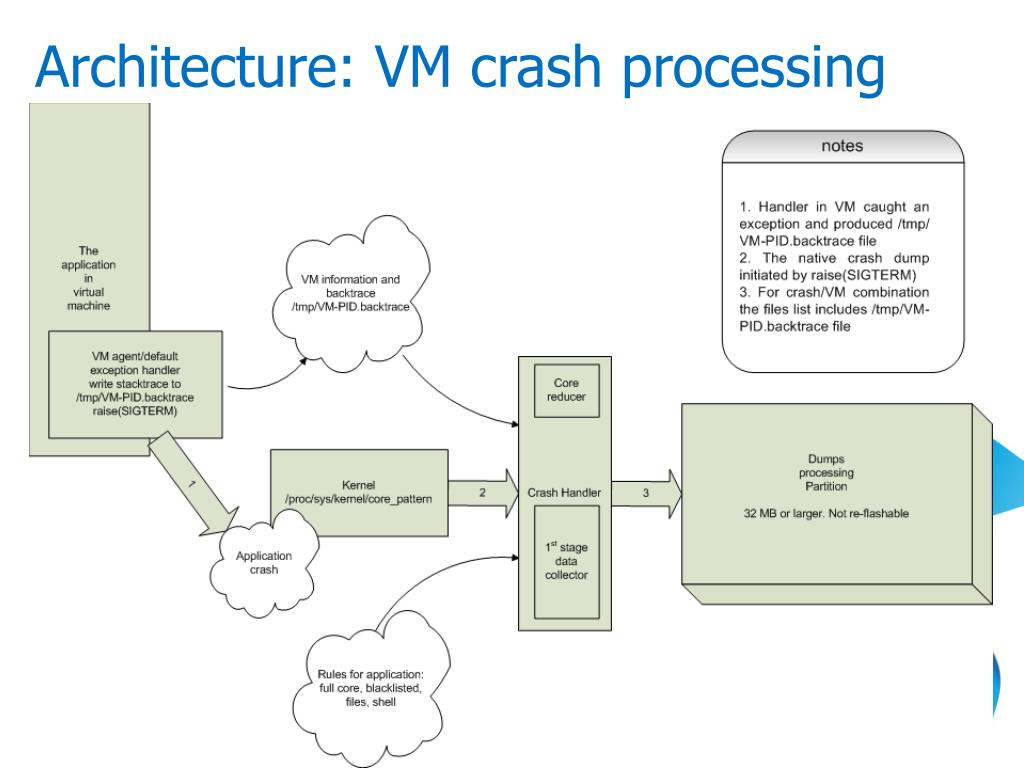 Android native – Google Breakpad • The Google Breakpad is a best multiplatform solution but: • Required linking for every process, according to documentation it leads to code changes but it can be done as a shared library • Not all application crashes can be handled – only after Breakpad initialized and if signal not handled by application • Produces minidumps based on: • ptracing crashed process – required CAP_SYS_PTRACE • processing core file – which might be up to 3 GB size • Dump generation done from server – so we may not have dumps when server is not started, crashed or already shut • By the way, debuggerd leaks in 4.2.1 about 25 MB dirty memory per 1000 crashes • File format is very strict and not compressed • Processor is already implemented and works for clients from Linux, Android, Windows, iOs, MacOS, Solaris, arm, x86, x86_64, ppc, ppc64, mips, sparc • The kernel panics are not supported at all even Android Panic facility is a part of kernel (apanic.c and apanic_mmc.c) • The VM crashes are not supported