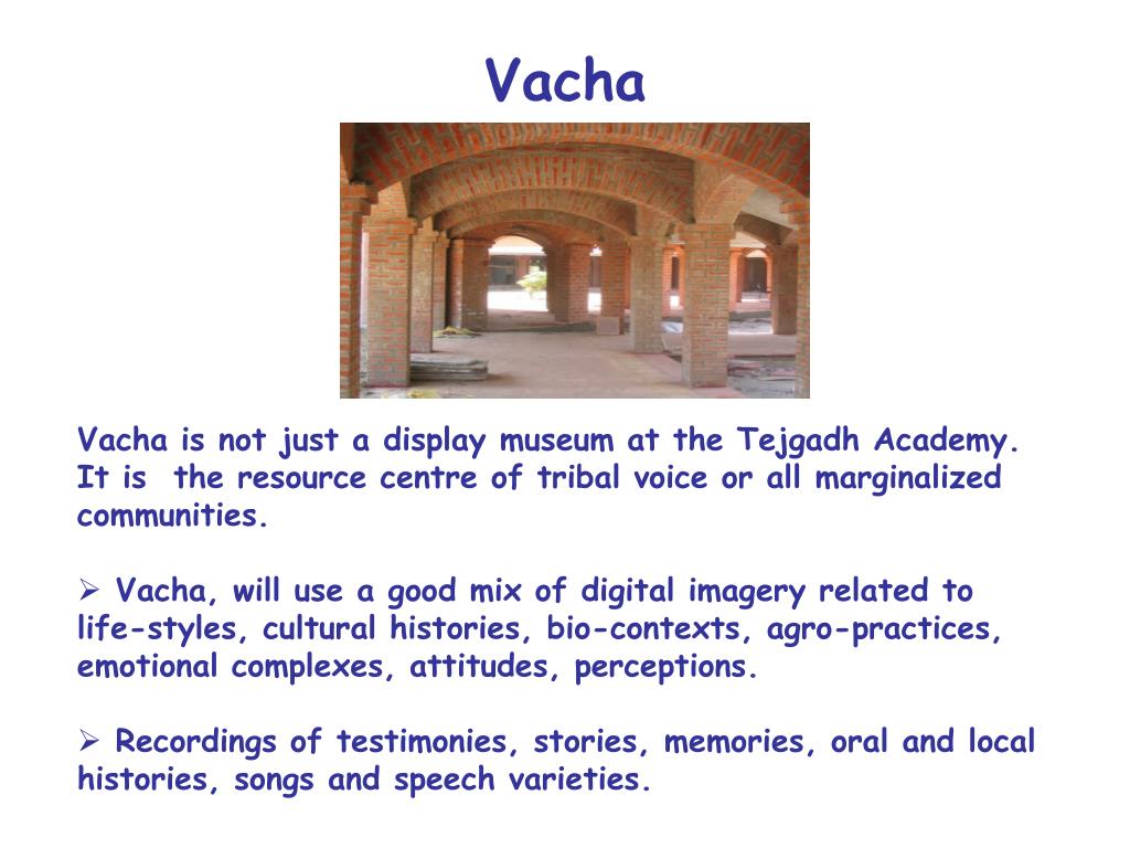 Vacha • Vacha is not just a display museum at the Tejgadh Academy. It is the resource centre of tribal voice or all marginalized communities. • Vacha, will use a good mix of digital imagery related to life-styles, cultural histories, bio-contexts, agro-practices, emotional complexes, attitudes, perceptions. • Recordings of testimonies, stories, memories, oral and local histories, songs and speech varieties.