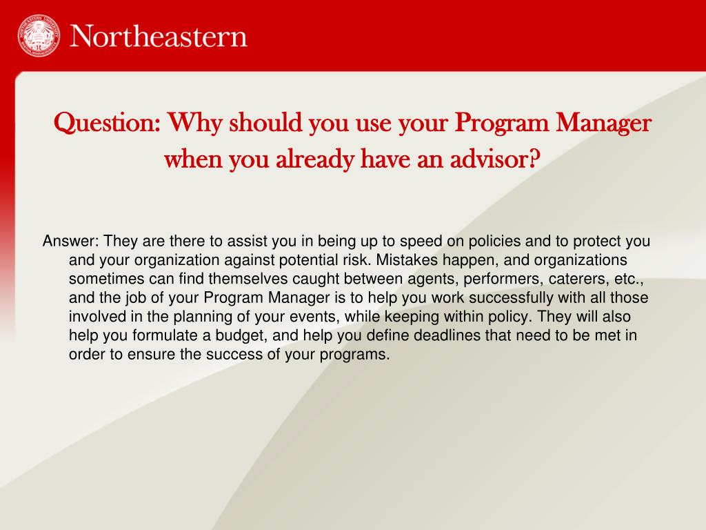 Question: Why should you use your Program Manager when you already have an advisor? Answer: They are there to assist you in being up to speed on policies and to protect you and your organization against potential risk. Mistakes happen, and organizations sometimes can find themselves caught between agents, performers, caterers, etc., and the job of your Program Manager is to help you work successfully with all those involved in the planning of your events, while keeping within policy. They will also help you formulate a budget, and help you define deadlines that need to be met in order to ensure the success of your programs.