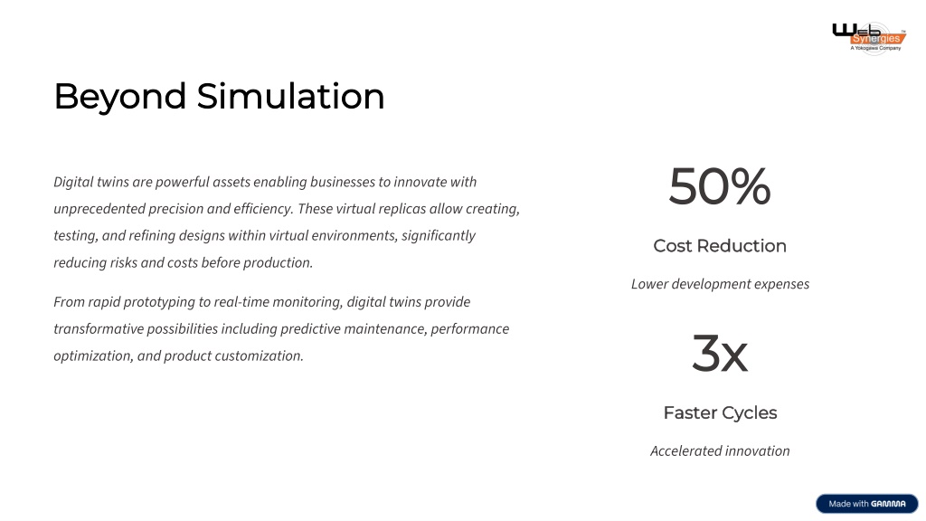 Beyond Simulation Beyond Simulation 50% 50% Digital twins are powerful assets enabling businesses to innovate with unprecedented precision and efficiency. These virtual replicas allow creating, testing, and refining designs within virtual environments, significantly reducing risks and costs before production. Cost Reduction Cost Reduction Lower development expenses From rapid prototyping to real-time monitoring, digital twins provide transformative possibilities including predictive maintenance, performance optimization, and product customization. 3x 3x Faster Cycles Faster Cycles Accelerated innovation preencoded.png