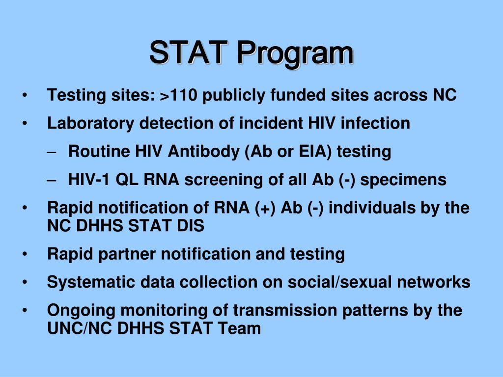STAT Program • Testing sites: >110 publicly funded sites across NC • Laboratory detection of incident HIV infection • Routine HIV Antibody (Ab or EIA) testing • HIV-1 QL RNA screening of all Ab (-) specimens • Rapid notification of RNA (+) Ab (-) individuals by the NC DHHS STAT DIS • Rapid partner notification and testing • Systematic data collection on social/sexual networks • Ongoing monitoring of transmission patterns by the UNC/NC DHHS STAT Team