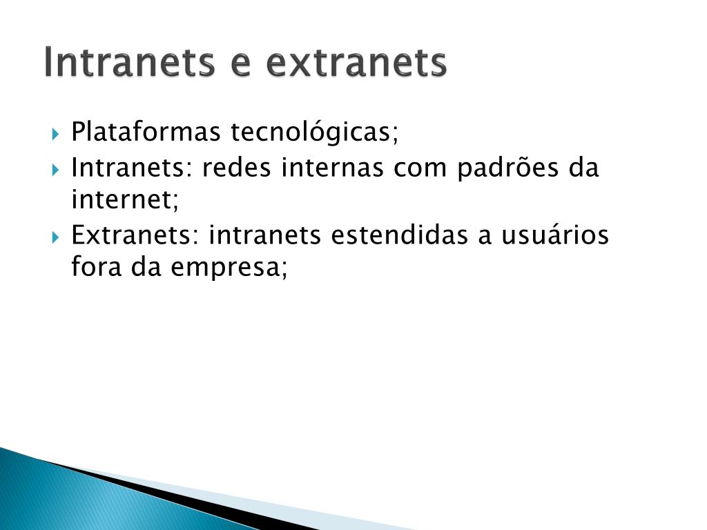 Intranets e extranets • Plataformas tecnológicas; • Intranets: redes internas com padrões da internet; • Extranets: intranets estendidas a usuários fora da empresa;