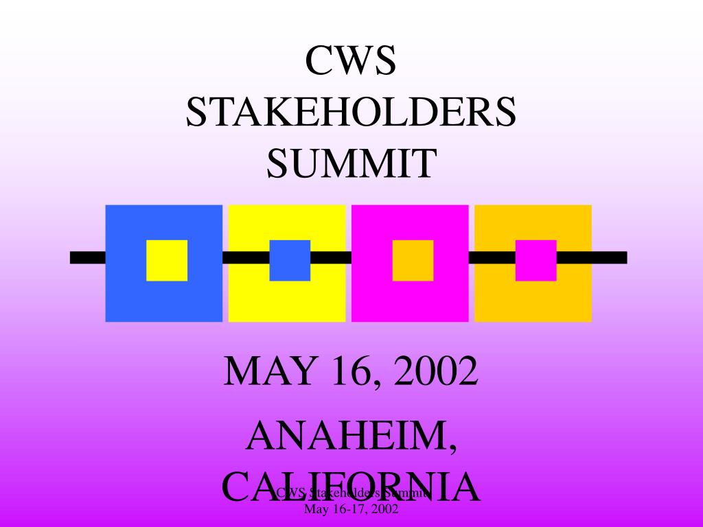 CWS STAKEHOLDERS SUMMIT MAY 16, 2002 ANAHEIM, CALIFORNIA CWS Stakeholders Summit May 16-17, 2002