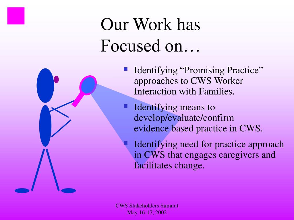 Our Work has Focused on… • Identifying “Promising Practice” approaches to CWS Worker Interaction with Families. • Identifying means to develop/evaluate/confirm evidence based practice in CWS. • Identifying need for practice approach in CWS that engages caregivers and facilitates change. CWS Stakeholders Summit May 16-17, 2002