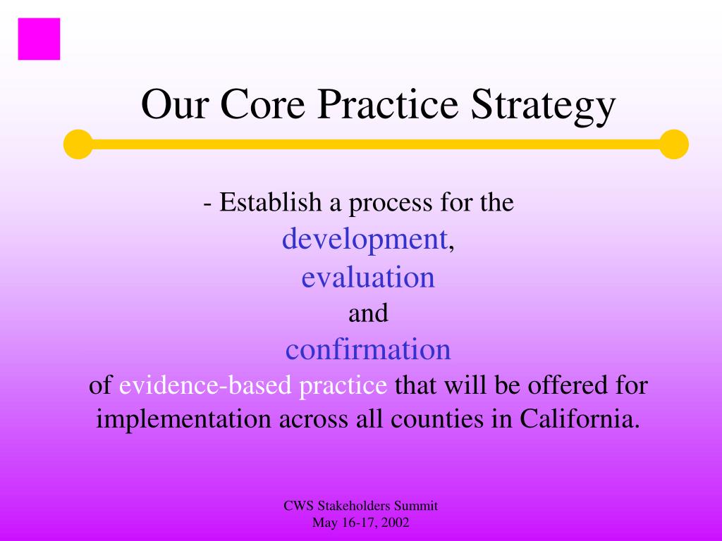 Our Core Practice Strategy - Establish a process for the development, evaluationand confirmationof evidence-based practice that will be offered for implementation across all counties in California. CWS Stakeholders Summit May 16-17, 2002