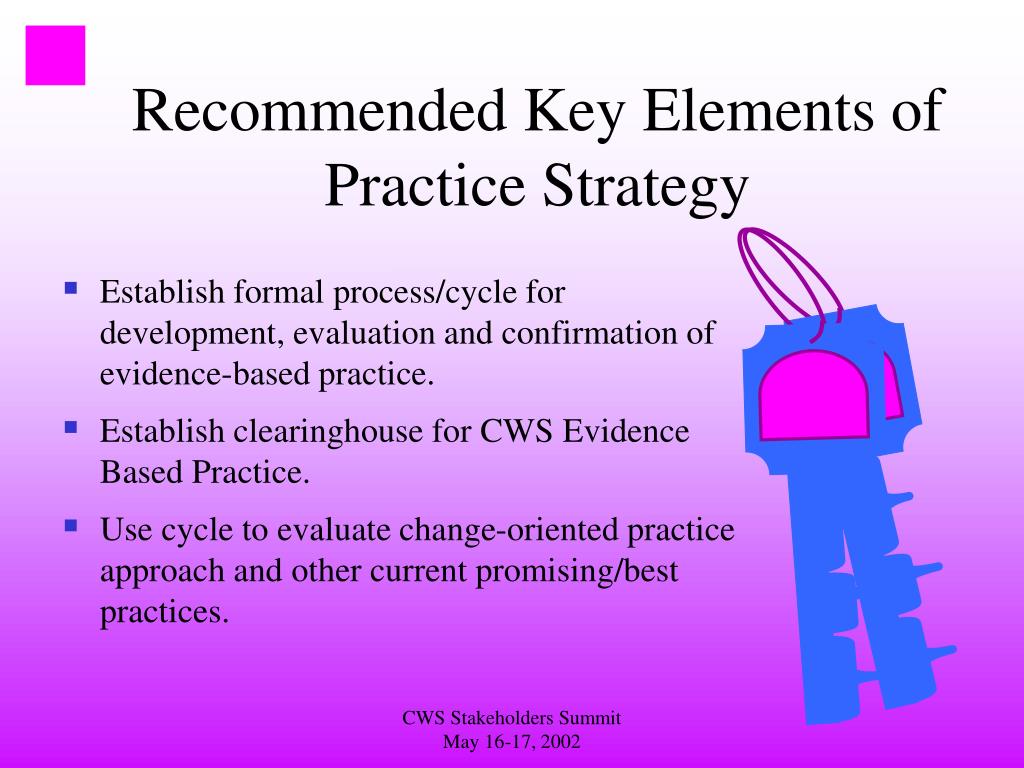 Recommended Key Elements of Practice Strategy • Establish formal process/cycle for development, evaluation and confirmation of evidence-based practice. • Establish clearinghouse for CWS Evidence Based Practice. • Use cycle to evaluate change-oriented practice approach and other current promising/best practices. CWS Stakeholders Summit May 16-17, 2002