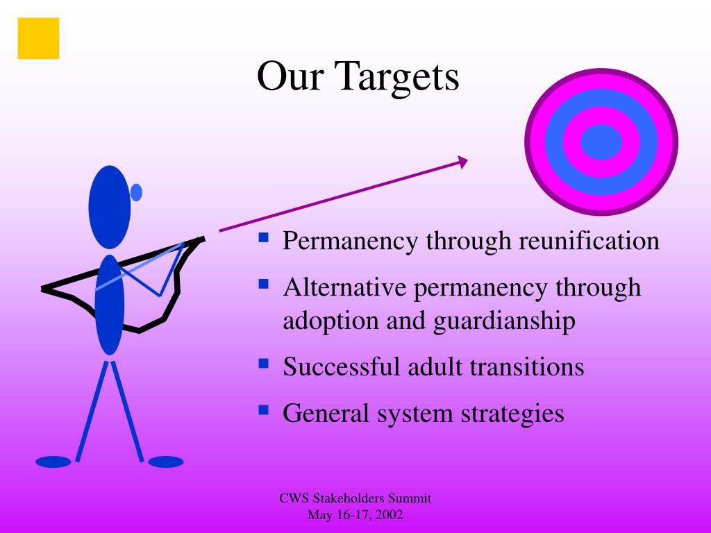 Our Targets • Permanency through reunification • Alternative permanency through adoption and guardianship • Successful adult transitions • General system strategies CWS Stakeholders Summit May 16-17, 2002