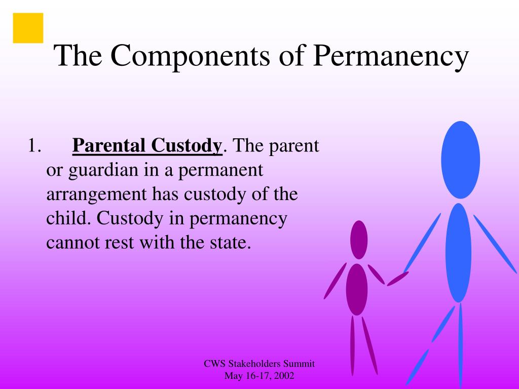 The Components of Permanency 1.Parental Custody. The parent or guardian in a permanent arrangement has custody of the child. Custody in permanency cannot rest with the state. CWS Stakeholders Summit May 16-17, 2002