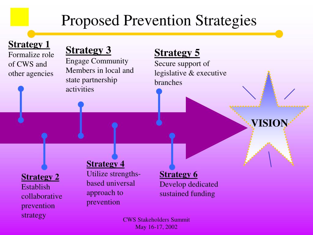 Proposed Prevention Strategies Strategy 1Formalize role of CWS and other agencies Strategy 3Engage Community Members in local and state partnership activities Strategy 5Secure support of legislative & executive branches VISION Strategy 4Utilize strengths-based universal approach to prevention Strategy 6Develop dedicated sustained funding Strategy 2Establish collaborative prevention strategy CWS Stakeholders Summit May 16-17, 2002