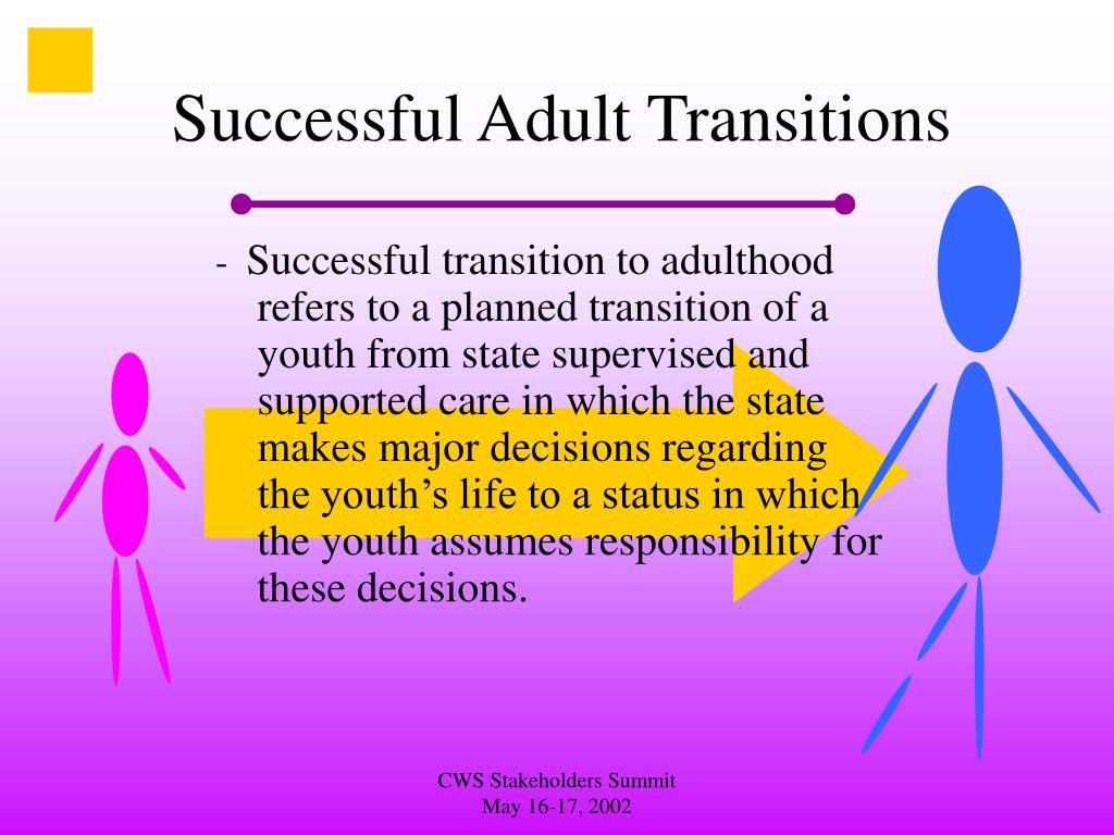 Successful Adult Transitions - Successful transition to adulthood refers to a planned transition of a youth from state supervised and supported care in which the state makes major decisions regarding the youth’s life to a status in which the youth assumes responsibility for these decisions. CWS Stakeholders Summit May 16-17, 2002