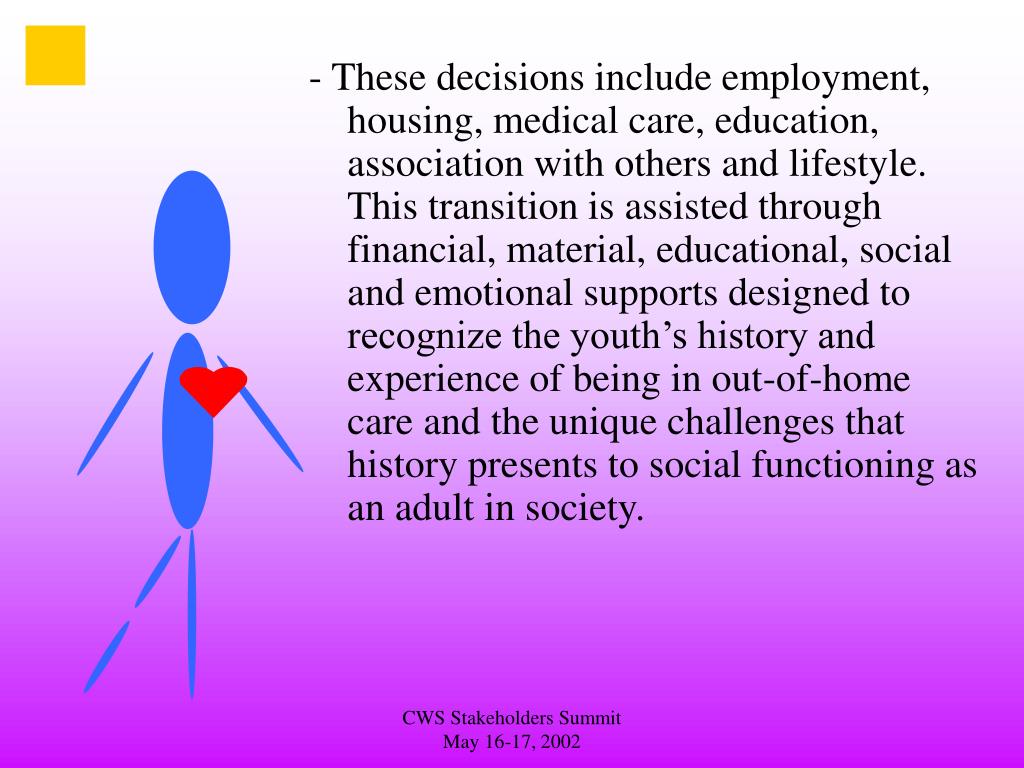 - These decisions include employment, housing, medical care, education, association with others and lifestyle. This transition is assisted through financial, material, educational, social and emotional supports designed to recognize the youth’s history and experience of being in out-of-home care and the unique challenges that history presents to social functioning as an adult in society. CWS Stakeholders Summit May 16-17, 2002