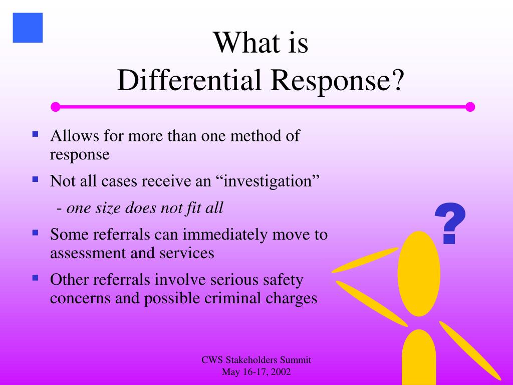 What is Differential Response? • Allows for more than one method of response • Not all cases receive an “investigation” - one size does not fit all • Some referrals can immediately move to assessment and services • Other referrals involve serious safety concerns and possible criminal charges ? CWS Stakeholders Summit May 16-17, 2002