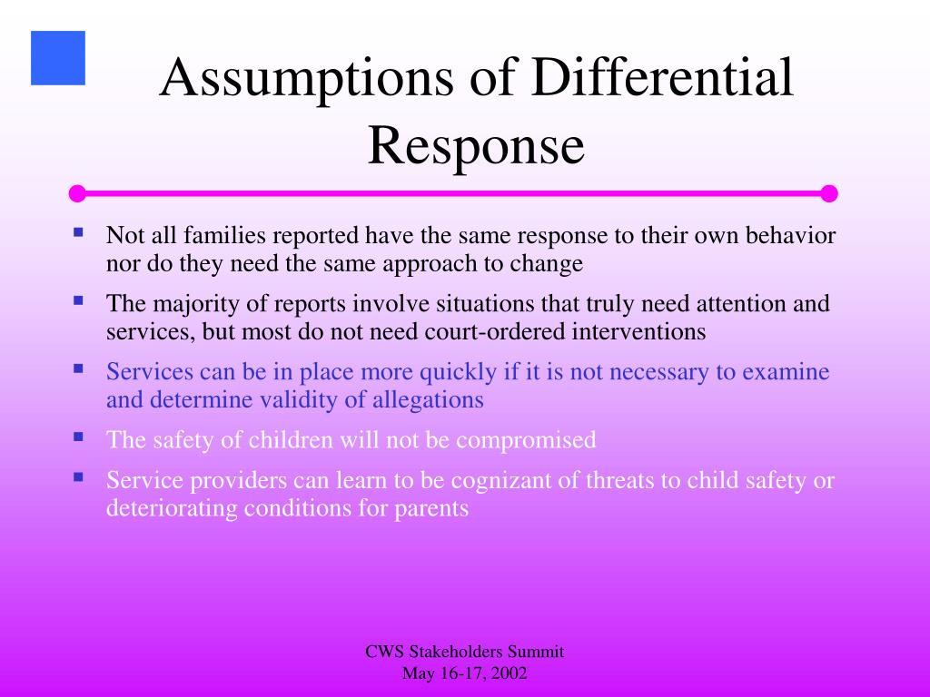 Assumptions of Differential Response • Not all families reported have the same response to their own behavior nor do they need the same approach to change • The majority of reports involve situations that truly need attention and services, but most do not need court-ordered interventions • Services can be in place more quickly if it is not necessary to examine and determine validity of allegations • The safety of children will not be compromised • Service providers can learn to be cognizant of threats to child safety or deteriorating conditions for parents CWS Stakeholders Summit May 16-17, 2002