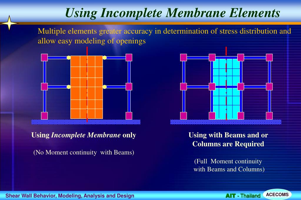 Using Incomplete Membrane Elements Multiple elements greater accuracy in determination of stress distribution and allow easy modeling of openings Using Incomplete Membrane only (No Moment continuity with Beams) Using with Beams and or Columns are Required (Full Moment continuity with Beams and Columns)