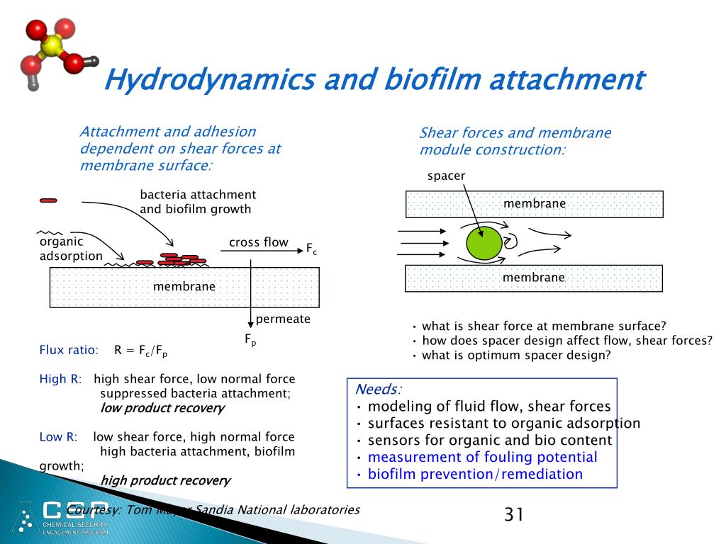 31 bacteria attachment and biofilm growth organic adsorption cross flow Fc membrane permeate Fp Hydrodynamics and biofilm attachment Attachment and adhesion dependent on shear forces at membrane surface: Shear forces and membrane module construction: spacer membrane membrane • what is shear force at membrane surface? • how does spacer design affect flow, shear forces? • what is optimum spacer design? Flux ratio: R = Fc/Fp High R: high shear force, low normal force suppressed bacteria attachment; low product recovery Low R: low shear force, high normal force high bacteria attachment, biofilm growth; high product recovery • Needs: • modeling of fluid flow, shear forces • surfaces resistant to organic adsorption • sensors for organic and bio content • measurement of fouling potential • biofilm prevention/remediation Courtesy: Tom Mayer Sandia National laboratories