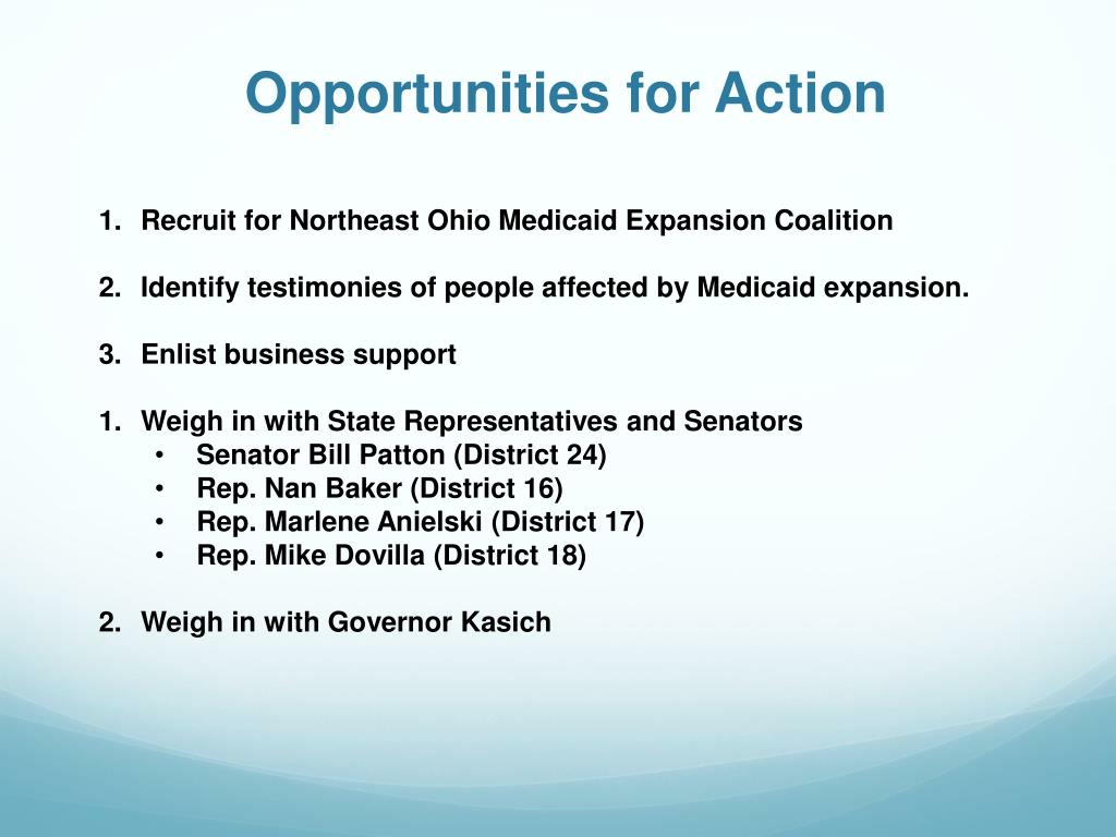 Opportunities for Action • Recruit for Northeast Ohio Medicaid Expansion Coalition • Identify testimonies of people affected by Medicaid expansion. • Enlist business support • Weigh in with State Representatives and Senators • Senator Bill Patton (District 24) • Rep. Nan Baker (District 16) • Rep. Marlene Anielski (District 17) • Rep. Mike Dovilla (District 18) • Weigh in with Governor Kasich
