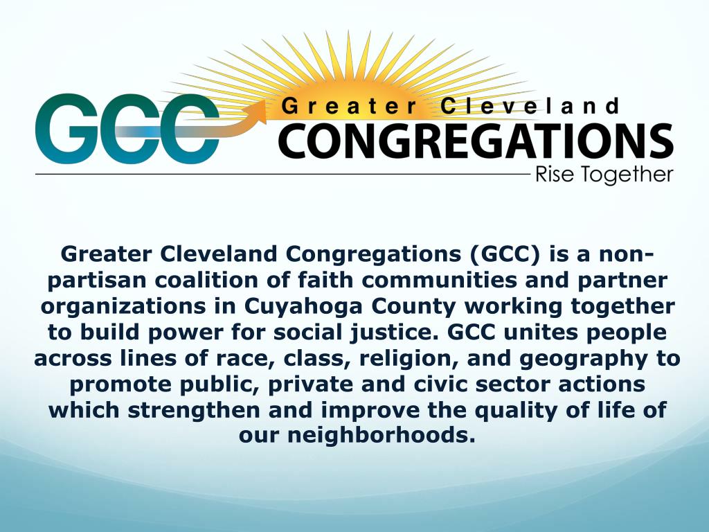 Greater Cleveland Congregations (GCC) is a non-partisan coalition of faith communities and partner organizations in Cuyahoga County working together to build power for social justice. GCC unites people across lines of race, class, religion, and geography to promote public, private and civic sector actions which strengthen and improve the quality of life of our neighborhoods.