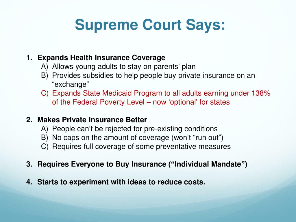 Supreme Court Says: • Expands Health Insurance Coverage • Allows young adults to stay on parents’ plan • Provides subsidies to help people buy private insurance on an “exchange” • Expands State Medicaid Program to all adults earning under 138% of the Federal Poverty Level – now ‘optional’ for states • Makes Private Insurance Better • People can’t be rejected for pre-existing conditions • No caps on the amount of coverage (won’t “run out”) • Requires full coverage of some preventative measures • Requires Everyone to Buy Insurance (“Individual Mandate”) • Starts to experiment with ideas to reduce costs.
