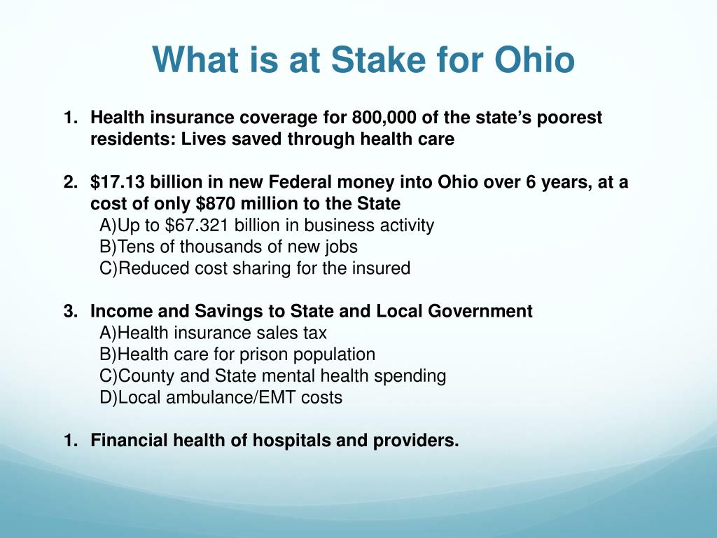 What is at Stake for Ohio • Health insurance coverage for 800,000 of the state’s poorest residents: Lives saved through health care • $17.13 billion in new Federal money into Ohio over 6 years, at a cost of only $870 million to the State • Up to $67.321 billion in business activity • Tens of thousands of new jobs • Reduced cost sharing for the insured • Income and Savings to State and Local Government • Health insurance sales tax • Health care for prison population • County and State mental health spending • Local ambulance/EMT costs • Financial health of hospitals and providers.