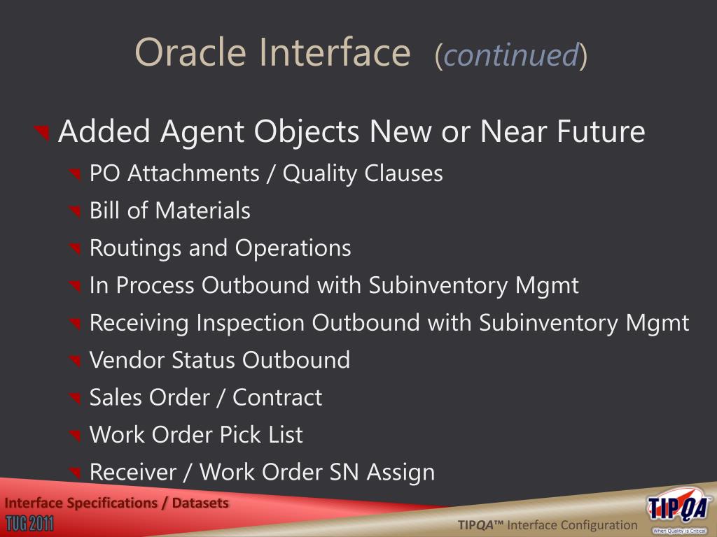 TIPQA™ Generic Interface Agent Objects Inbound • Contract • Item Master • Commodity • Department • Vendor • Work Order • POLine • Receiver • Receiver Stock • BOM • SN Config • Routing Interface Specifications / Datasets