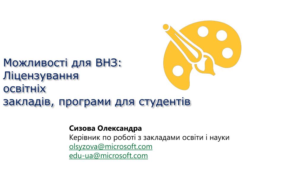 Сизова ОлександраКерівник по роботі з закладами освіти і наукиolsyzova@microsoft.comedu-ua@microsoft.com Можливості для ВНЗ: Ліцензування освітніх закладів, програми для студентів
