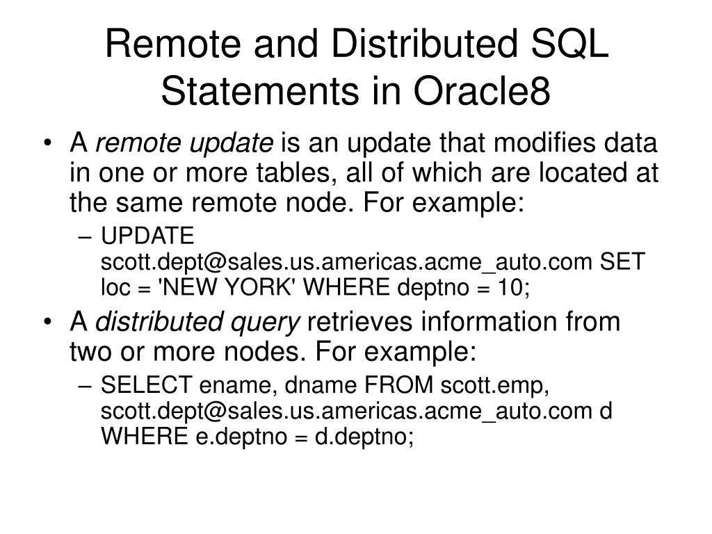 Remote and Distributed SQL Statements in Oracle8 • A remote update is an update that modifies data in one or more tables, all of which are located at the same remote node. For example: • UPDATE scott.dept@sales.us.americas.acme_auto.com SET loc = 'NEW YORK' WHERE deptno = 10; • A distributed query retrieves information from two or more nodes. For example: • SELECT ename, dname FROM scott.emp, scott.dept@sales.us.americas.acme_auto.com d WHERE e.deptno = d.deptno;