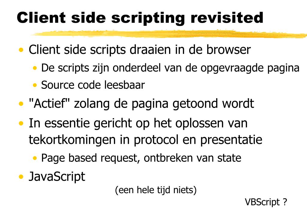 Client side scripting revisited • Client side scripts draaienin de browser • De scripts zijnonderdeel van de opgevraagdepagina • Source code leesbaar • "Actief" zolang de paginagetoondwordt • In essentiegericht op het oplossen van tekortkomingen in protocol en presentatie • Page based request, ontbreken van state • JavaScript (eenheletijdniets) VBScript ?