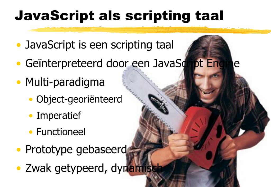 JavaScript als scripting taal • JavaScript is een scripting taal • Geïnterpreteerd door een JavaScript Engine • Multi-paradigma • Object-georiënteerd • Imperatief • Functioneel • Prototype gebaseerd • Zwakgetypeerd, dynamisch