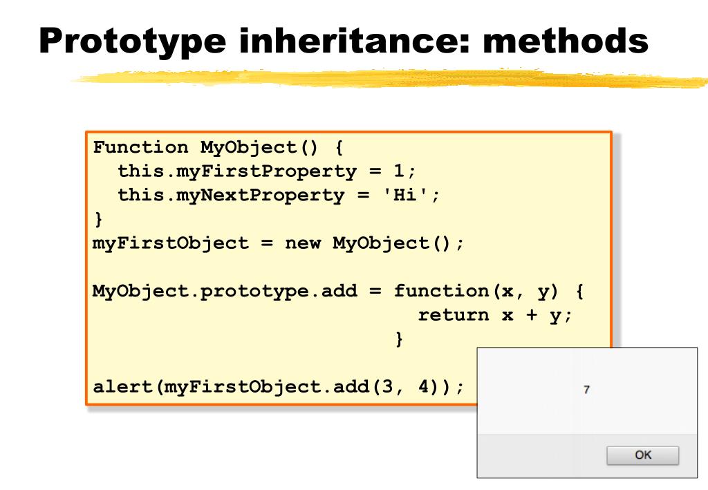 Prototype inheritance: methods Function MyObject() { this.myFirstProperty = 1; this.myNextProperty = 'Hi'; } myFirstObject = new MyObject(); MyObject.prototype.add= function(x, y) { return x + y; } alert(myFirstObject.add(3, 4));