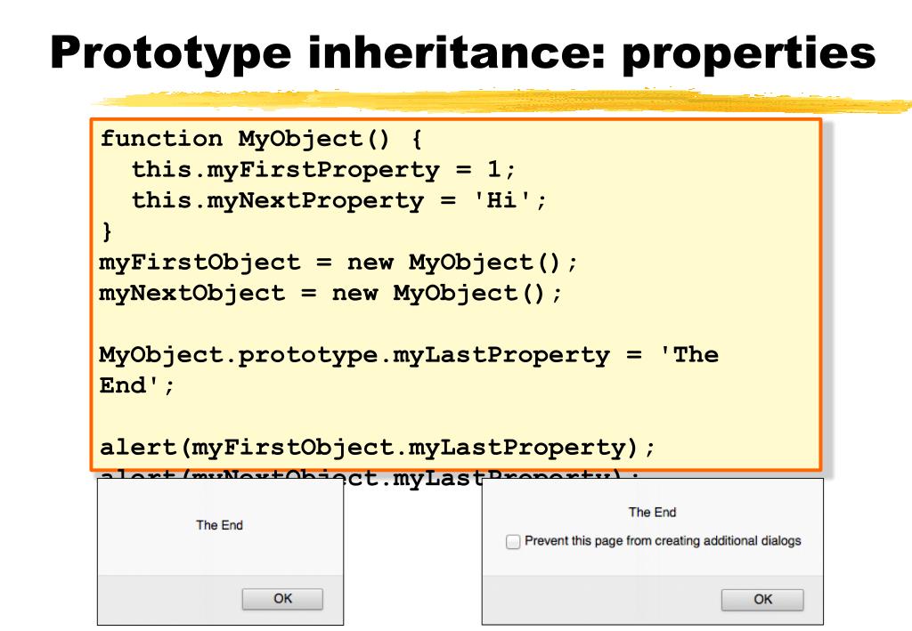 Prototype inheritance: properties function MyObject() { this.myFirstProperty = 1; this.myNextProperty = 'Hi'; } myFirstObject = new MyObject(); myNextObject = new MyObject(); MyObject.prototype.myLastProperty= 'The End'; alert(myFirstObject.myLastProperty); alert(myNextObject.myLastProperty);