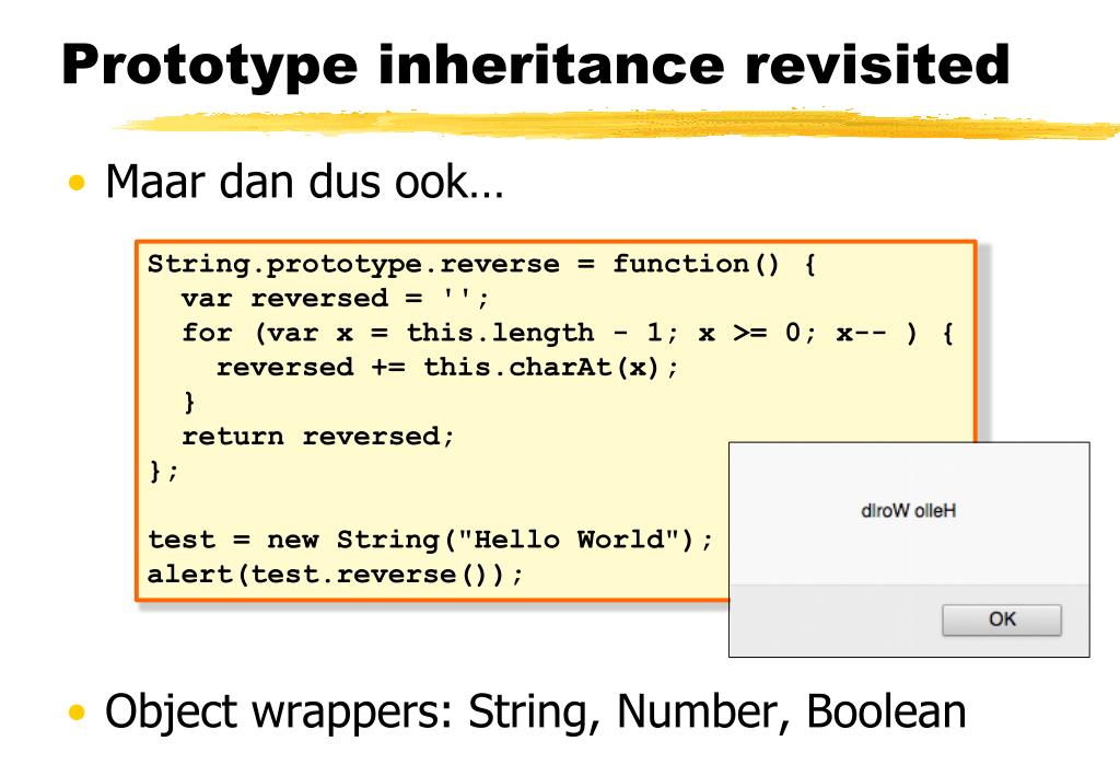 Prototype inheritance revisited • Maar dandusook… • Object wrappers: String, Number, Boolean String.prototype.reverse = function() { var reversed = ''; for (var x = this.length - 1; x >= 0; x-- ) { reversed += this.charAt(x); } return reversed; }; test = new String("Hello World"); alert(test.reverse());