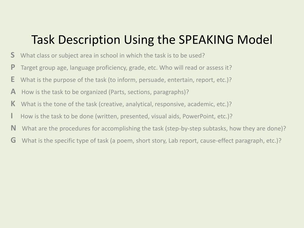Task Description Using the SPEAKING Model SWhat class or subject area in school in which the task is to be used? PTarget group age, language proficiency, grade, etc. Who will read or assess it? EWhat is the purpose of the task (to inform, persuade, entertain, report, etc.)? AHow is the task to be organized (Parts, sections, paragraphs)? KWhat is the tone of the task (creative, analytical, responsive, academic, etc.)? IHow is the task to be done (written, presented, visual aids, PowerPoint, etc.)? NWhat are the procedures for accomplishing the task (step-by-step subtasks, how they are done)? GWhat is the specific type of task (a poem, short story, Lab report, cause-effect paragraph, etc.)?