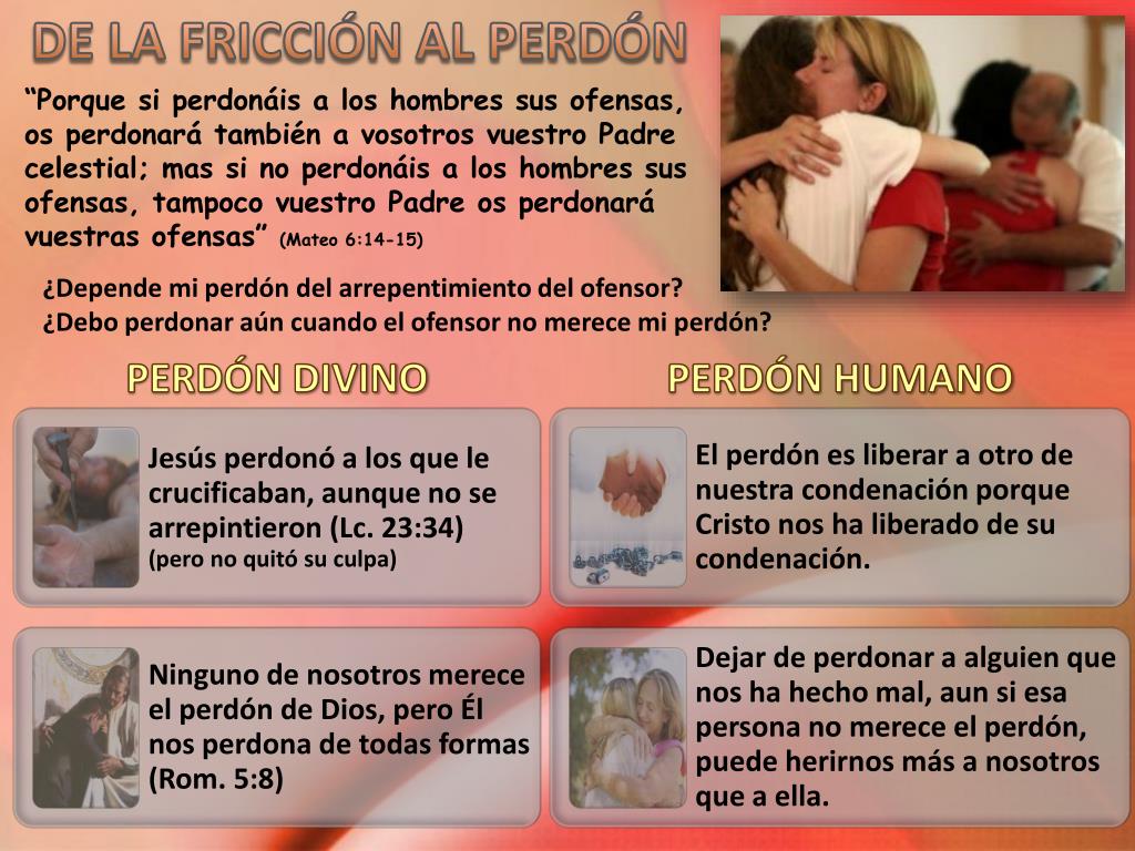 DE LA FRICCIÓN AL PERDÓN “Porque si perdonáis a los hombres sus ofensas, os perdonará también a vosotros vuestro Padre celestial; mas si no perdonáis a los hombres sus ofensas, tampoco vuestro Padre os perdonará vuestras ofensas” (Mateo 6:14-15) ¿Depende mi perdón del arrepentimiento del ofensor? ¿Debo perdonar aún cuando el ofensor no merece mi perdón? PERDÓN DIVINO PERDÓN HUMANO