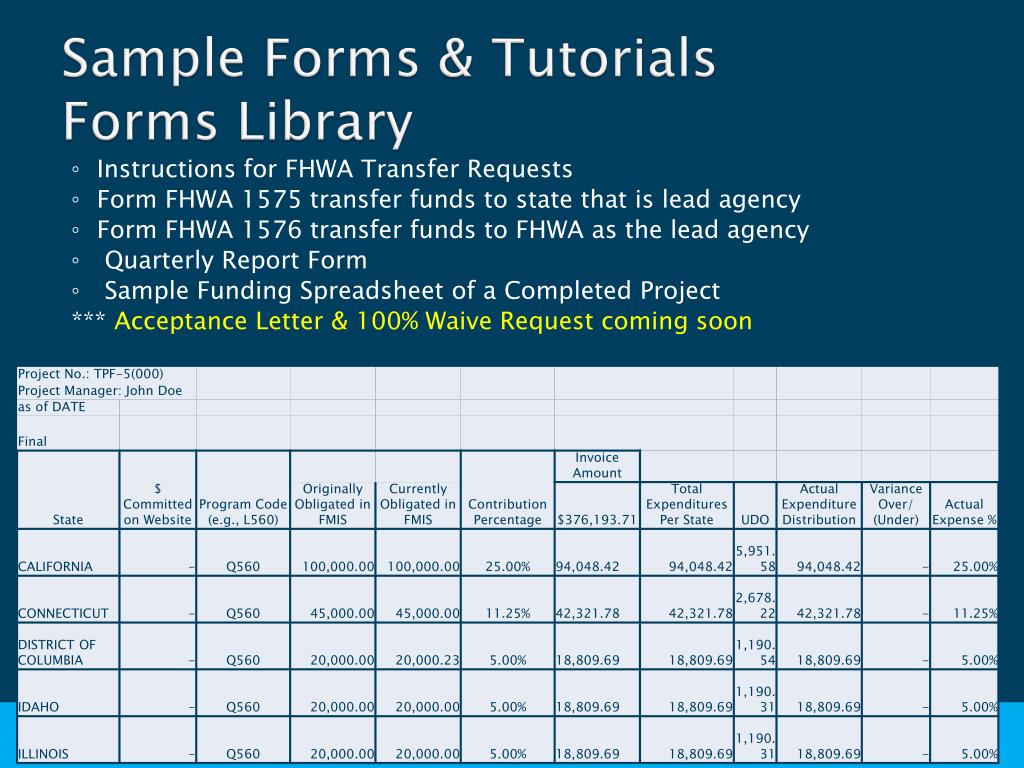 Sample Forms & Tutorials Forms Library • Instructions for FHWA Transfer Requests • Form FHWA 1575 transfer funds to state that is lead agency • Form FHWA 1576 transfer funds to FHWA as the lead agency • Quarterly Report Form • Sample Funding Spreadsheet of a Completed Project *** Acceptance Letter & 100% Waive Request coming soon