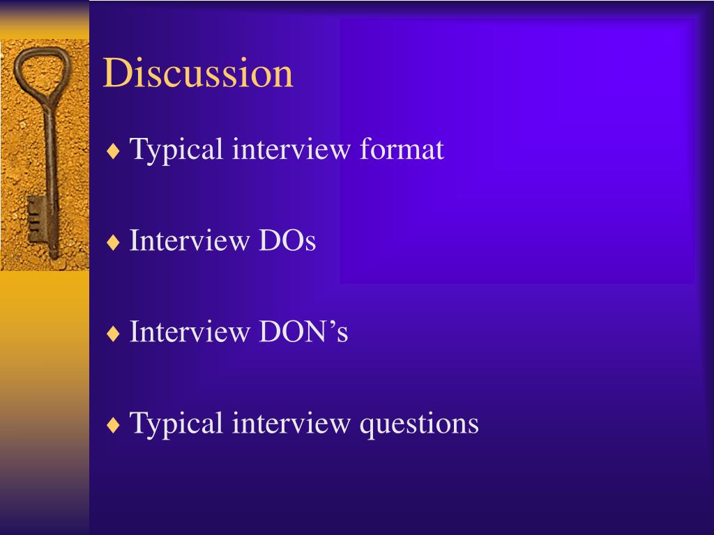 Discussion • Typical interview format • Interview DOs • Interview DON’s • Typical interview questions