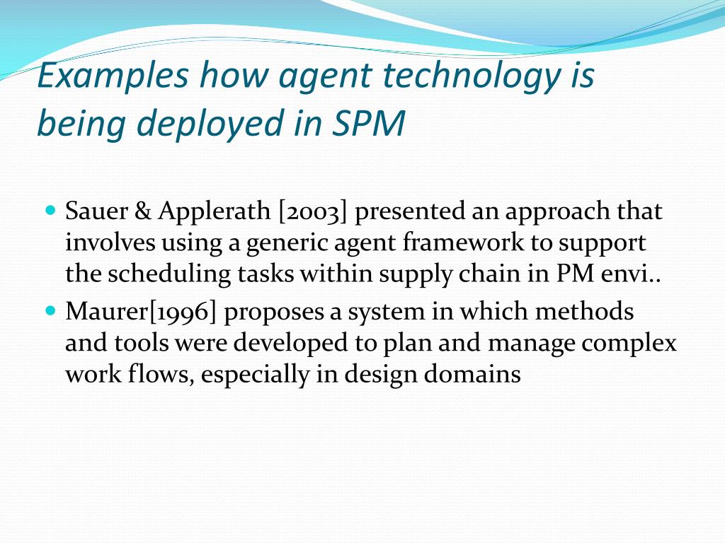 Examples how agent technology is being deployed in SPM • Sauer & Applerath [2003] presented an approach that involves using a generic agent framework to support the scheduling tasks within supply chain in PM envi.. • Maurer[1996] proposes a system in which methods and tools were developed to plan and manage complex work flows, especially in design domains